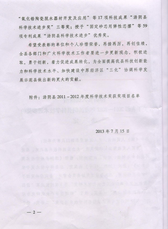 關于表彰2011-2012年度湯陰縣科學技術進步獎的決定